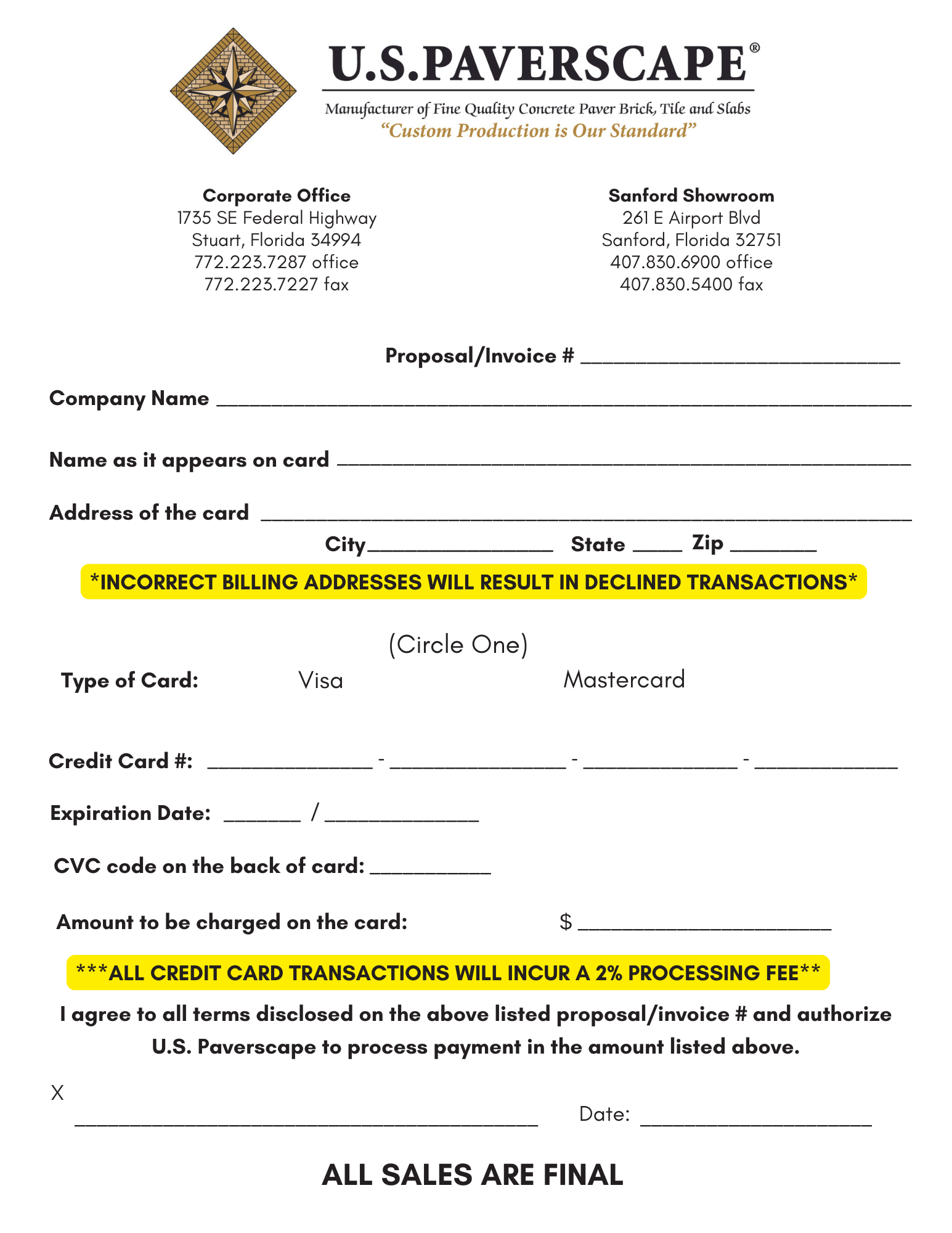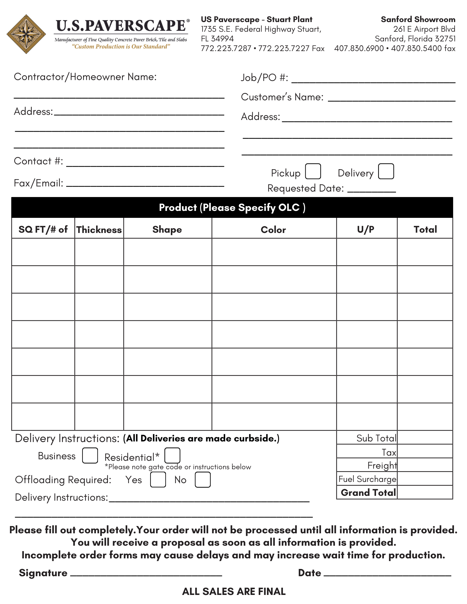 FormsSpecificationsColor SheetsNTO Release Form Order Form Delivery Instructions Credit Application Credit Card Authorization Form Boca Brick Castlescape Cobblescape DOT Brick Grandscape Groovestone Mega Square Stock Copings Product Specifications Coping Options Stock Wall Block Options Grey Cement White Cement Solid NTO Release Request